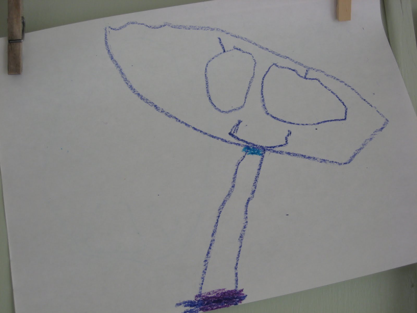 We finally got to the head-people-with-legs-coming-out-of-their-necks stage, although she does not claim them as people. They are aliens. Not. People. To be fair, they do look more like aliens than people. This one is wearing its bathing suit and swimming in a puddle.