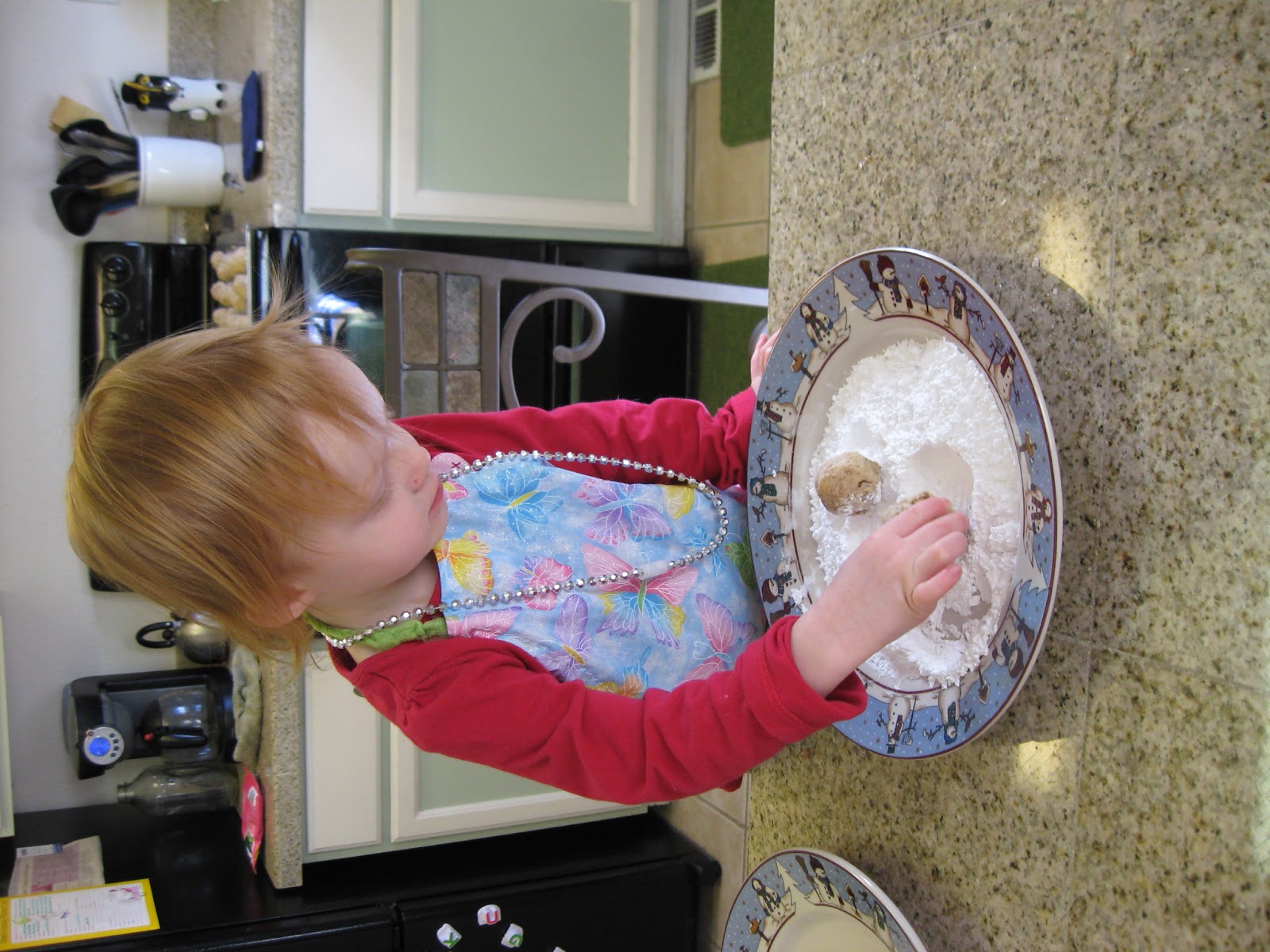 As part of our Winter Wonderland curriculum (through Wee Folk Art), we made snowball cookies to go with the story. They are actually Russian Teacakes, but they really do look like snowballs!